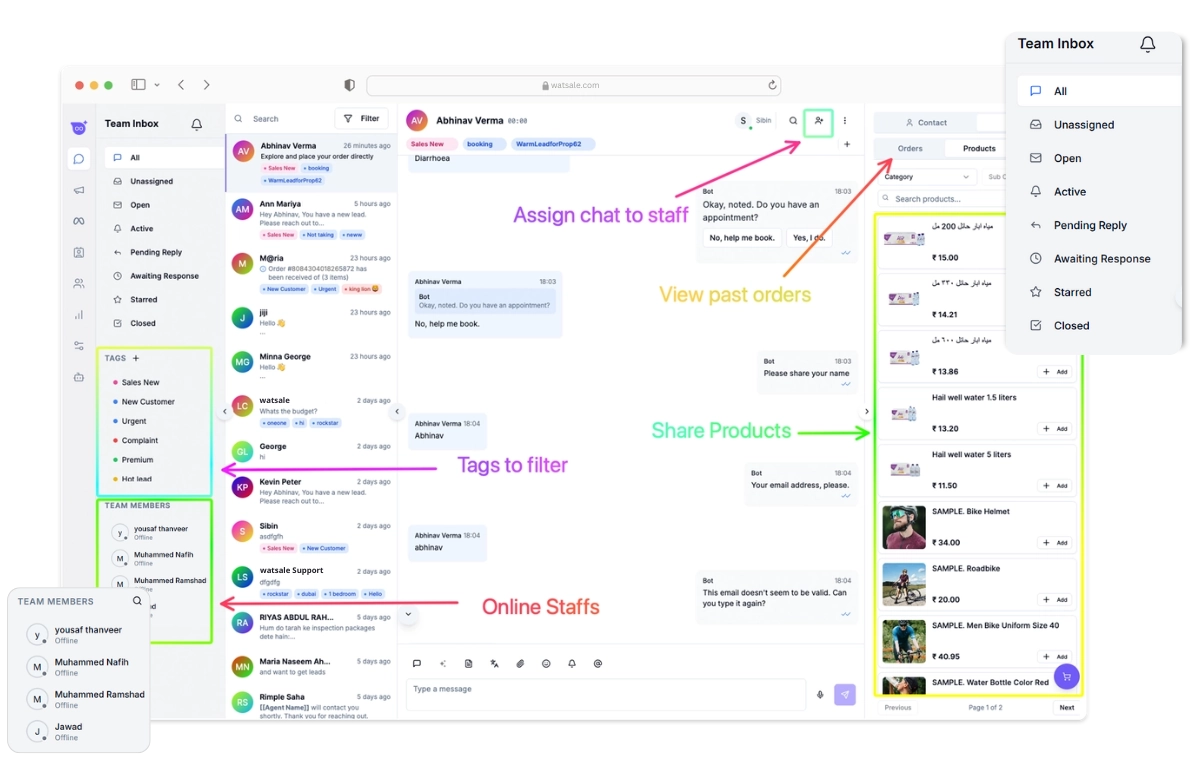 Send bulk WhatsApp messages instantly. Manage team responses for incoming customer chats.